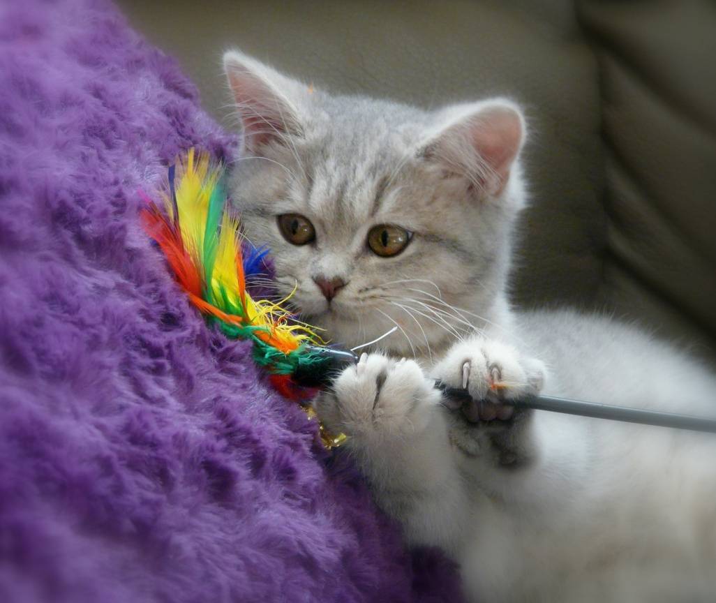 Существуют игрушки для котят на резинке. Они крепятся к дверной ручке и очень мягкие на ощупь. Их преимущество в том, что не смогут сломаться, потеряться или травмировать котенка.