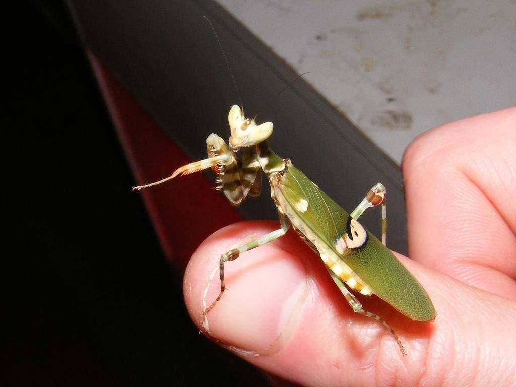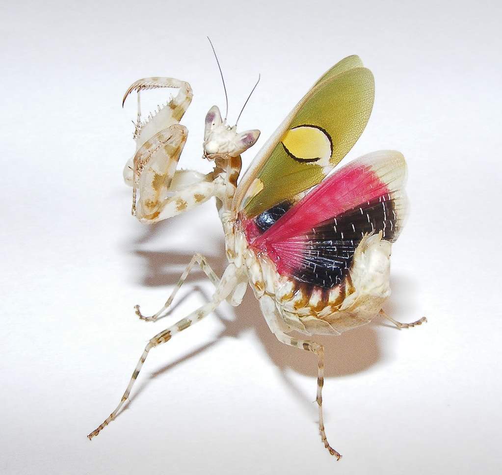 | Blepharopsis mendica | Маленький дьявольский цветочный богомолЦветочный богомол дьяволаЧертополох богомолЕгипетский цветочный богомолАрабский богомол | Северная Африка, Канарские острова | Дейматический дисплей голова и грудная клетка повернуты в одну сторону. | |