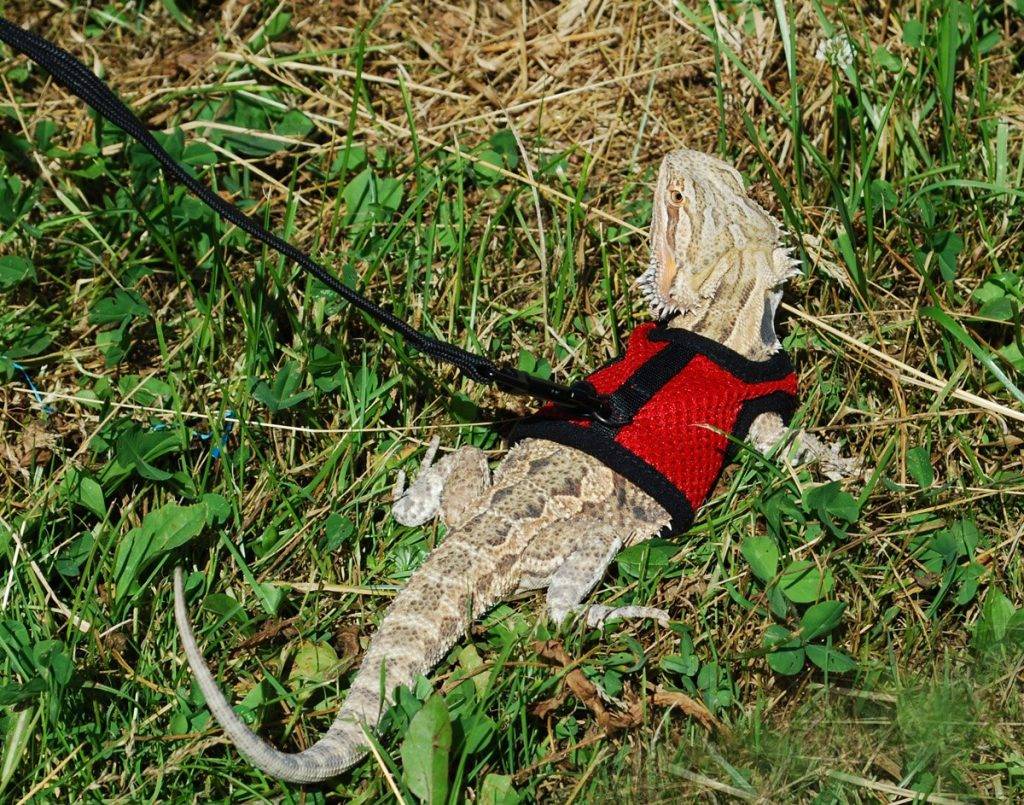 Многих ящериц, в том числе игуан, часто приучают к выгулу на шлейке. Для агамы это не подходит: у неё специфическое строение тела и очень хрупкий позвоночник, который рывок шлейки может повредить. Перевозить агам нужно в специальном закрытом контейнере.