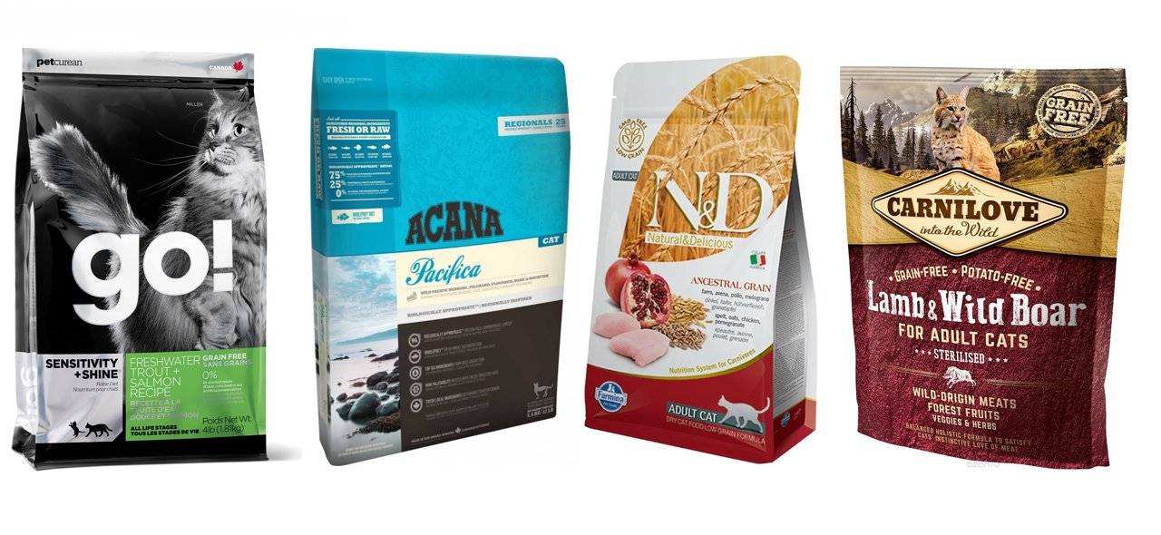 - GO!. Ассортимент продукции представлен в виде низкозерновых и беззерновых кормов для кошек. Состав дополнительно обогащают лососевым маслом, клюквой и люцерной. Цена разнится в зависимости от вида. Средняя цена 400 – 450 рублей за 1 кг.
