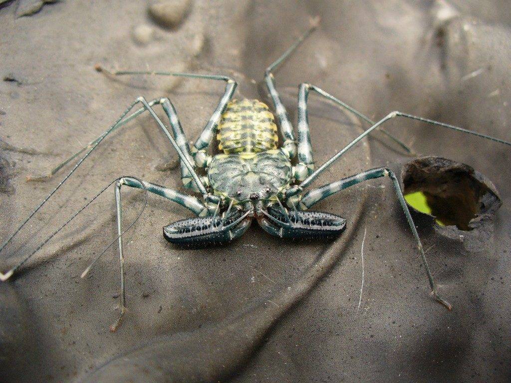 Одни из самых неприятных уродцев обитают во влажных тропических и субтропических лесах по всей планете. Дополнительно жгутоногого паука называют «бесхвостый скорпион-кнут» либо «бич-паук». При размерах округлого тела, не превышающих 5 см, фрин обладает довольно длинными ногами, вырастающими до 25-30 см. Туловище защищено панцирем, на котором выделяются 4 пары глаз: 1 медиальная и 3 боковые.