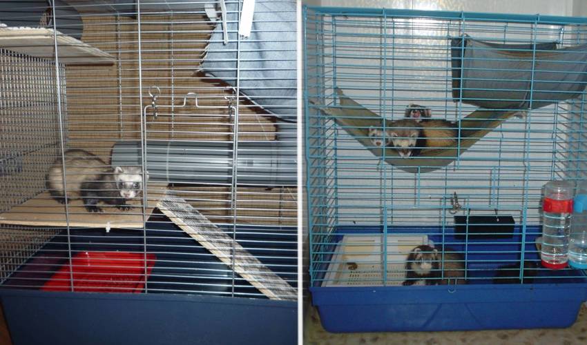 Жилище зверька должно быть достаточно приличных размеров, так как хорьки очень подвижные и любят пространство. Нужно приобрести клетку площадью не менее 80 кв.см., чтобы там поместить мисочку с кормом и поилку, лоток, подвесной гамачок, коробки и трубы(там хорьки будут устраивать себе лабиринты), колесо и другие «игрушки». Обязательно нужно оборудовать уютное, тихое, затемненное место, скрытое от посторонних глаз — там ваш любимец будет отдыхать или прятаться в состоянии стресса. Клетка предпочтительнее из строительной сетки, так как малыш не сломает зубки, если решит погрызть прутья.