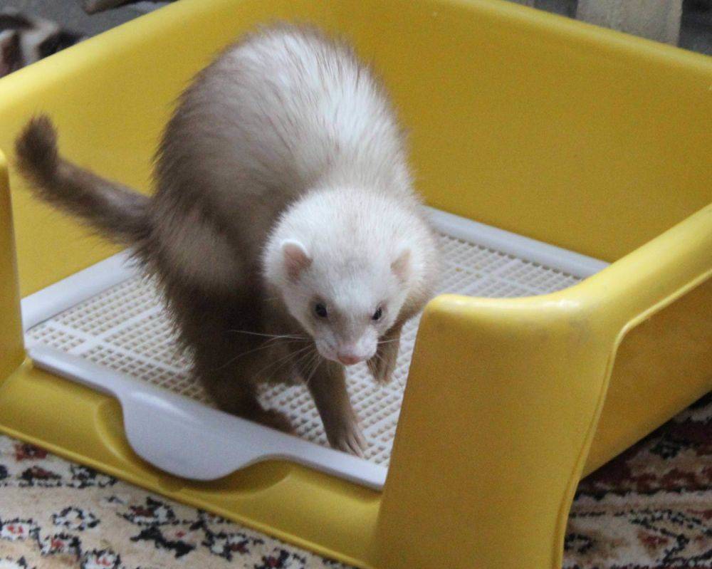 Чтобы фекалии не были разбросаны по углам, лоток надежно фиксируют. Если хорек не перенял от матери навык опорожнения в лоток, придется его приучать примерно так: