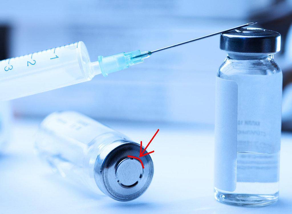 Чтобы открыть флакон или создать доступ к резиновой крышке, нужно отогнуть края надсечек (одна из них показана красной стрелкой)