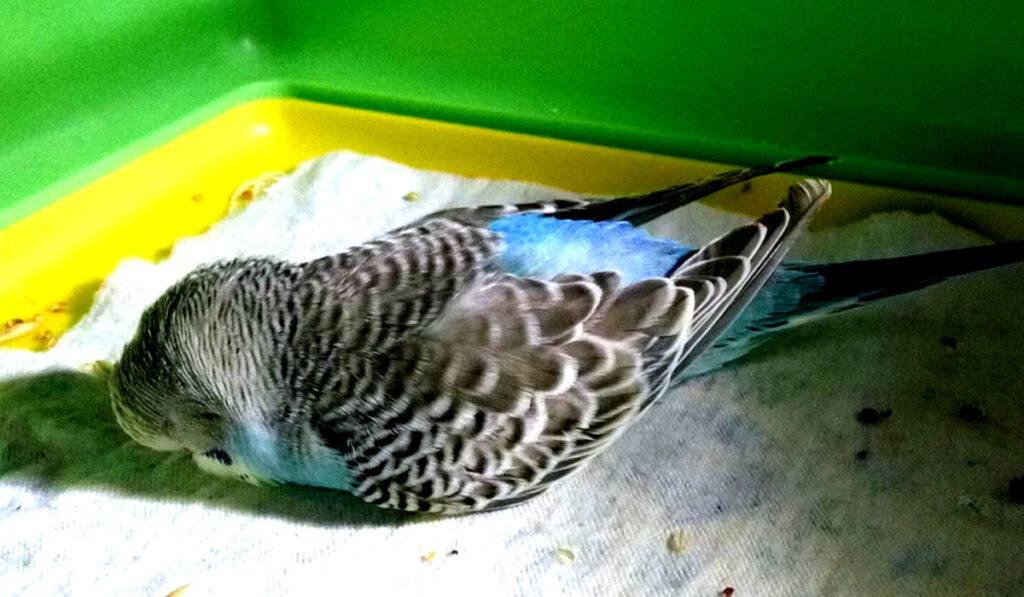 Больной волнистый попугай отсаживается от других особей в спокойное место. На дно клетки укладывают белые бумажные листы, чтобы постоянно отслеживать состояние испражнений.