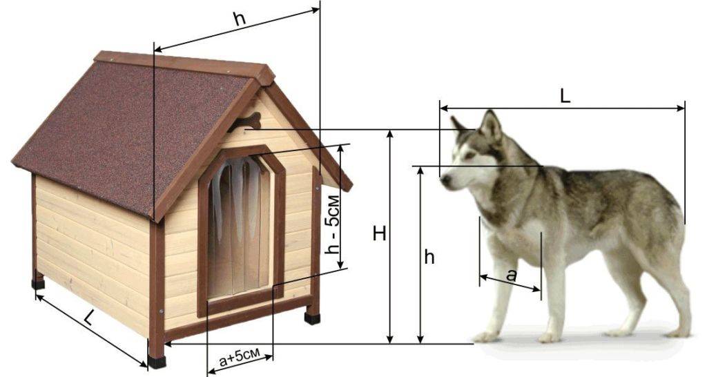 Высота кабины выбрана так: высота животного в холке с прибавкой 15-20 см. Глубина внутреннего пространства должна позволять собаке полностью вытянуться в положении лежа на боку, то есть соблюдается следующее правило: длина собаки от кончика хвоста до когтей передних лап вытянута вперед с добавкой 12-16 см. Ширина конуры должна позволять собаке вытягиваться, то есть размеры должны быть не менее длины животного от кончика носа до хвоста плюс 10-15 см.