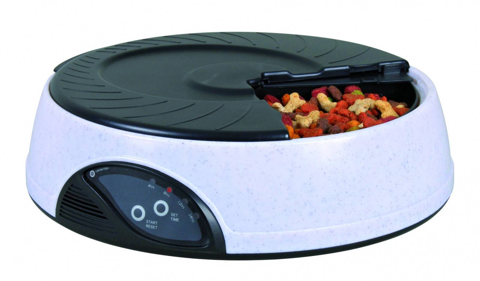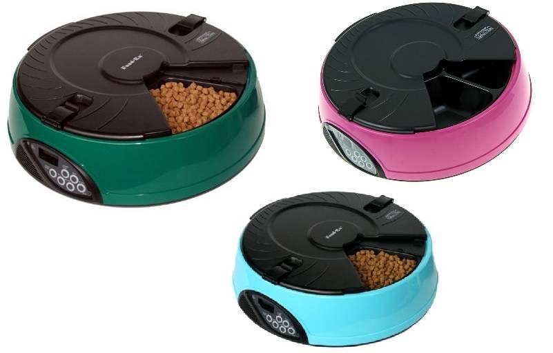 Почти все автоматические кормушки для животных используют программируемый таймер, который позволяет точно определить, когда и сколько еды животное будет получать. Автоматическая кормушка с таймером содержит до 5 кг корма для собак или до 2 кг для кошек и может быть запрограммирована для того, чтобы выдавать еду 3 раза в день. Питание может быть запрограммировано на раздачу от 1/4 до 3 чашек еды за раз. Поэтому, если домашнее животное маленького размера, то можно с легкостью следить за здоровым рационом питомца.