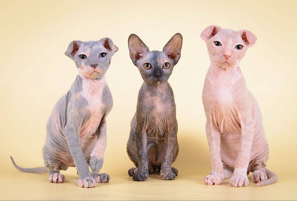 Внешность этих кошек поистине уникальна. Малыши одного помета могут даже иметь различия между собой. Отличием может выступать отсутствие шерсти на шкурках котят. У некоторых она бывает едва заметной на некоторых участках, у других распространяется по всему телу. Третьи же рождаются полностью лысыми. Окрас кожи тоже бывает разным.