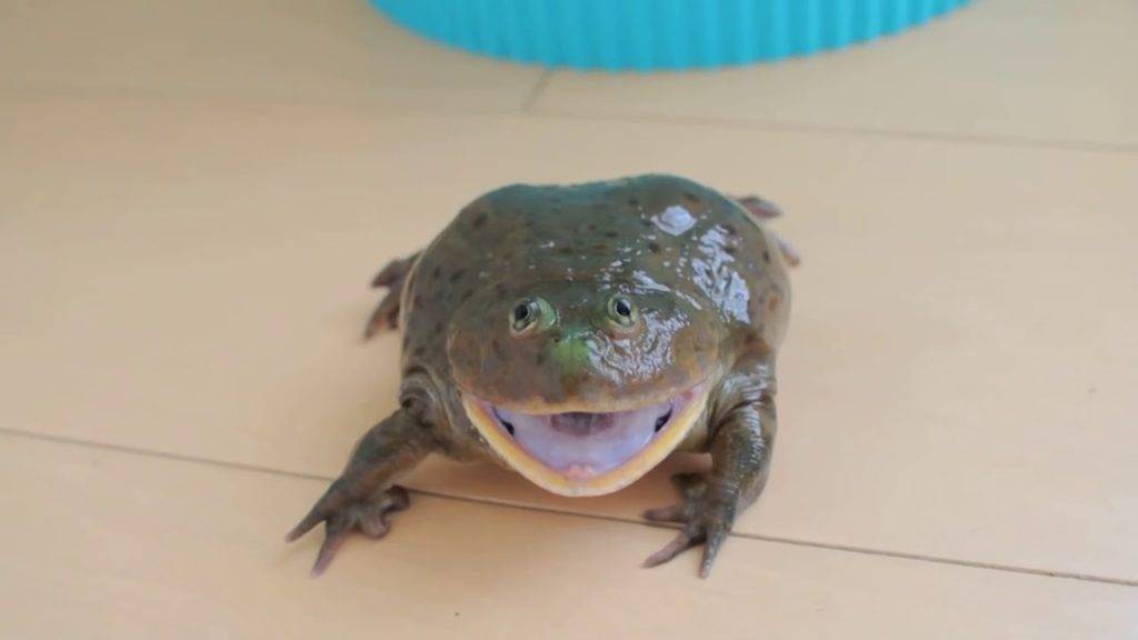Едва почувствовав угрозу, лягушка раздувается, выпрямляет лапы и во всю раскрывает большущий рот, где легко разглядеть два весьма острых на вид нароста на нижней челюсти.