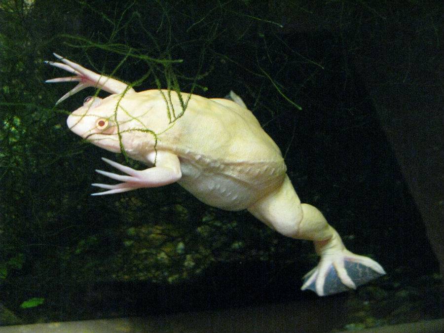 Итак, если аквариумные лягушки белые или розоватые, с красными глазками, то независимо от размера это шпорцевые. Шпорцевая лягушка-альбинос была выведена искусственно в московском Институте биологии развития для лабораторных опытов.