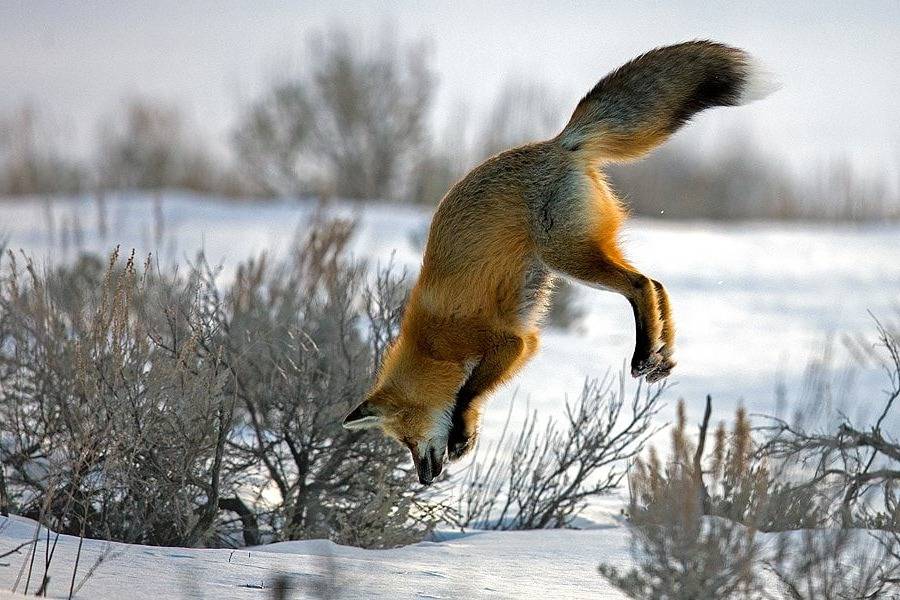 Зверь выходит на поиски добычи вечером или ранним утром. При ловле грызунов лисица полагается на свой отличный слух. Определив место положение грызуна под снегом, землей или опавшими листьями, животное совершает прыжок и моментально откапывает грызуна, не давая ему шансов убежать.