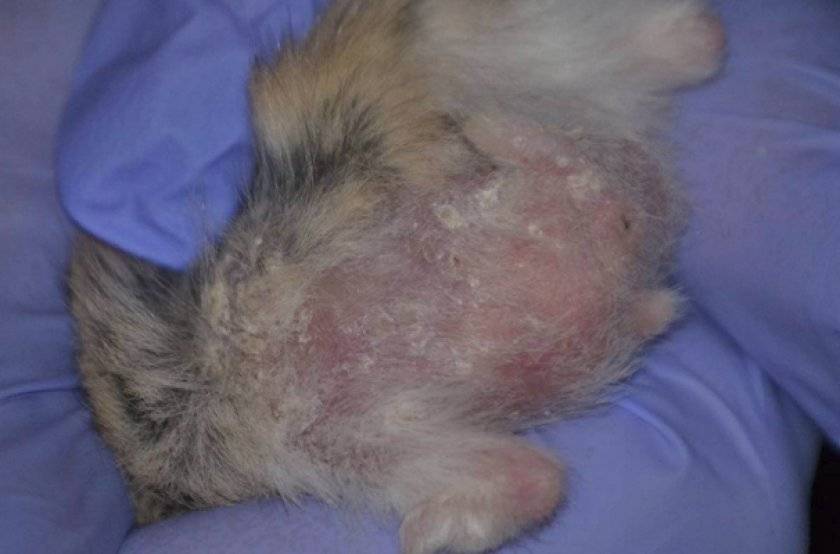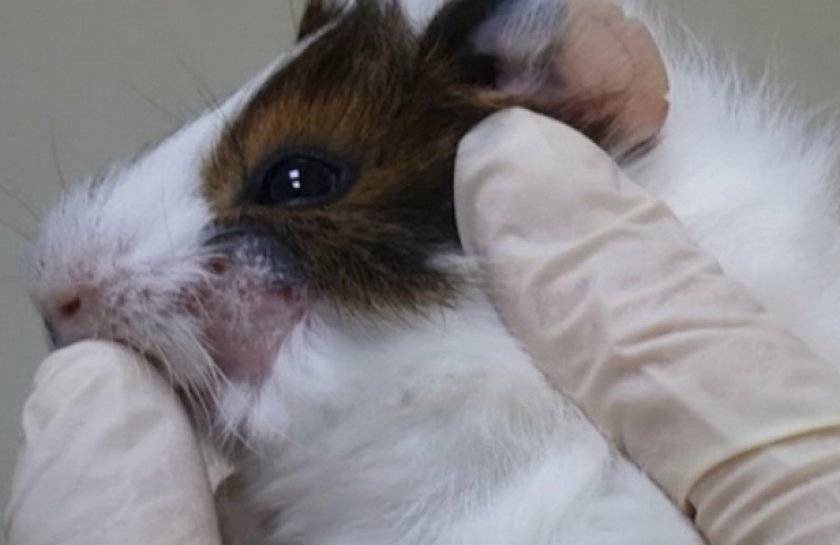 Он характеризуется залысинами на мордочке и передней части тела. Увидеть животного, которое поражено этим заболеванием вы можете на фото. Эти пятна довольно сильно зудят, и грызун самостоятельно их расчёсывает, это приводит к тому, что грибок распространяется на здоровые участки.