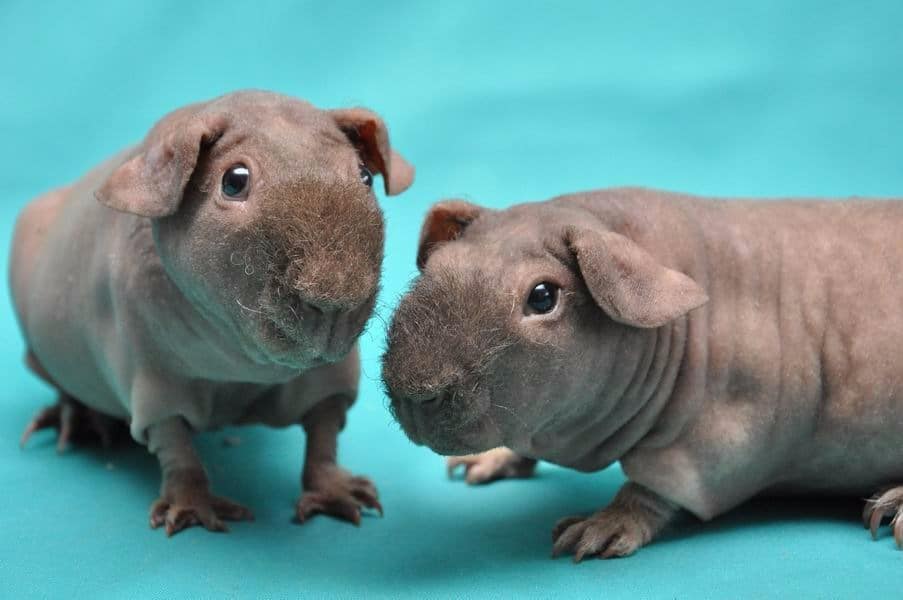 В отличие от свинок болдуин, скинни рождаются абсолютно лысыми. По мере взросления на мордочке и шее появляется редкий шерстный покров длиной 0,3-1 см. Внешне питомцы похожи на маленьких бегемотиков.