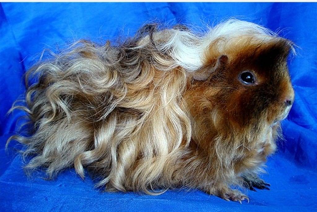 Это самая красивая порода длинношерстых морских свинок, и она появилась в результате скрещивания двух пород: шелти и королевской (Рекс). Их кудрявая шерстка растет по направлению от головы. Кроме этого, она рассыпается каскадом по всей спине от пробора, обрамляя голову без длинной шерсти. Длина волосков может доходить до 15 сантиметров.