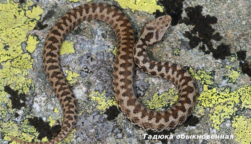 Гадюка — существует несколько видов, обитает по всей России, кроме арктического побережья. Обыкновенная гадюка встречается чаще всего. Обычная окраска серая, на спине — зигзагообразный рисунок или шашечки. Бывают красновато-бурые и черные гадюки. Длина около 60 см. Смертность для животных от укуса от двух до пяти процентов.