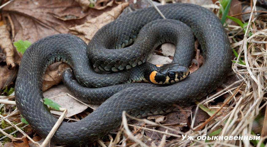 Дальневосточный тигровый уж – относится к условно ядовитым змеям, обыкновенный уж — обычно черной окраски, главное отличие от гадюки — желтые пятна по бокам головы. Не опасен, предпочитает уползти или притвориться мертвым.