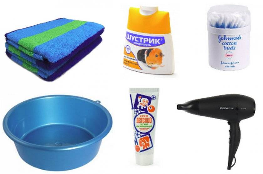 - полотенца. Одно — чтобы завернуть и просушить зверька, а второе укладывается на дно таза, чтобы у свинки не скользили лапы;