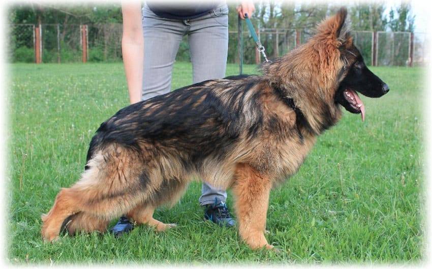 - Шерсть длинная, жесткая (Отдельные участки остевого волоса длиннее, не всегда прямые не плотно прилегают к телу. Это заметно на ушах и внутри них, там образуются целые пучки, на задней стороне предплечий и бедер. На поясницы волос длиннее. Хвост пушистый с небольшим подвесом. Такой тип немецкой овчарки более чувствителен к разным температурным условиям.