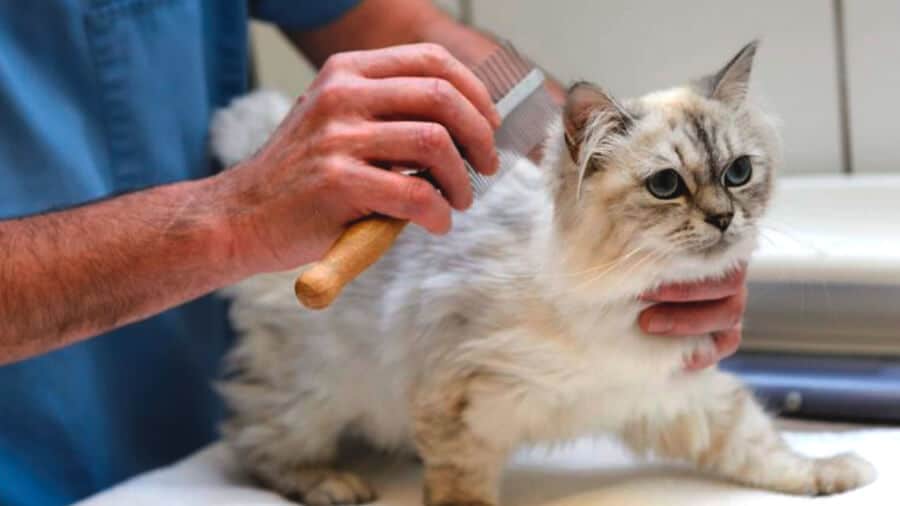 Котенка ставят над листом белой бумаги ,шерсть вычесывают жесткой и частой пластмассовой расческой с закругленными зубцами. Можно приобрести специальную «чесалку» для котят. Вычесывают сначала спину, переходя к бокам и животику, лапам. На один сеанс вычесывания в среднем уходит примерно десять минут.