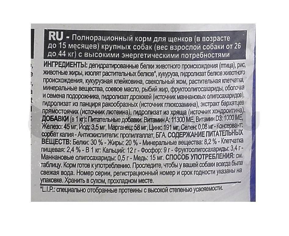 Что мы увидим, прочитав на упаковке состав? Делаем пометку: речь идет о корме для крупных взрослых собак, чей вес достигает 45 килограмм.