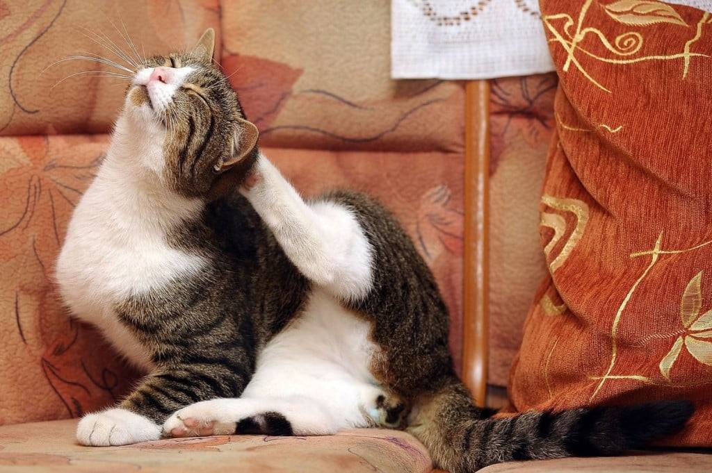 - Зараженная кошка начинает активно чесаться и кусать себя, пытаясь поймать паразитов.