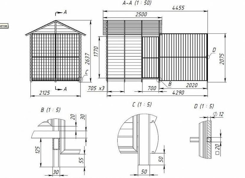- Часть стен вольера должна быть глухой для защиты от ветра. Можно сделать полностью закрытый вольер с огороженной прогулочной площадкой.