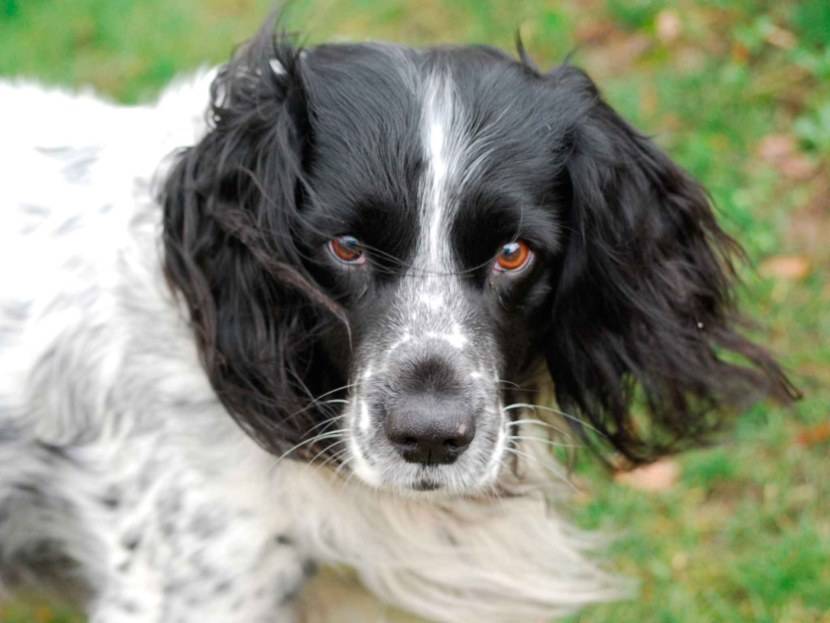 - Английский спрингер-спаниель. Охотничий пес, родословная которого уходит корнями в средневековье. Это бесстрашный сопровождающий, который умеет поднимать дичь, даже не обладая хорошим нюхом. Английские особи имеют чисто белый или черно белый окрас. Допускаются сияющие пятна.