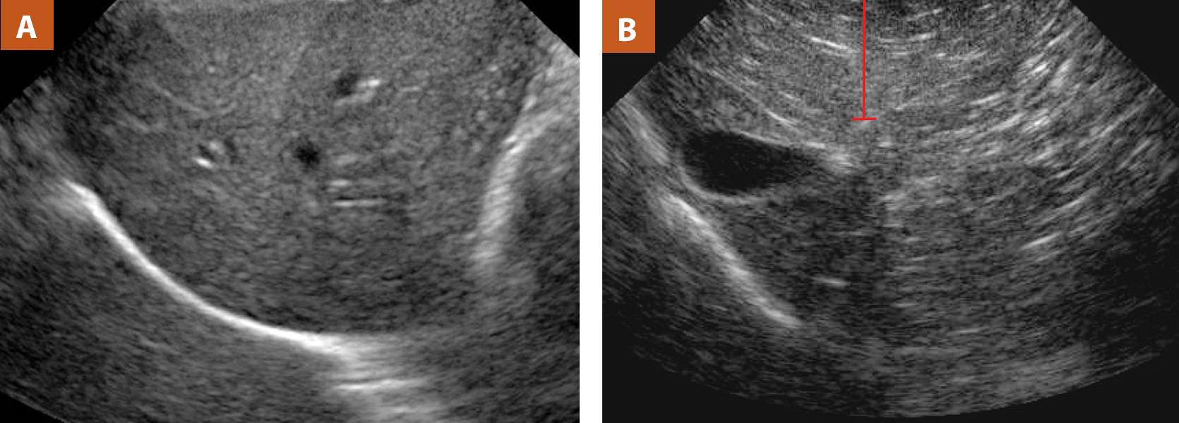 Рисунок 1. (A) Продольное изображение печени собаки. Структура и эхогенность печени в норма с чёткими стенками портальных вен (гиперэхогенные) и печеночных вен (изоэхогенные). Криволинейная гиперэхогенная линия, отделяющая краниальную периферию печени в дальнем поле, представляет собой отраженный интерфейс легкого / диафрагмы и печени. (B) Продольный скан печени кошки