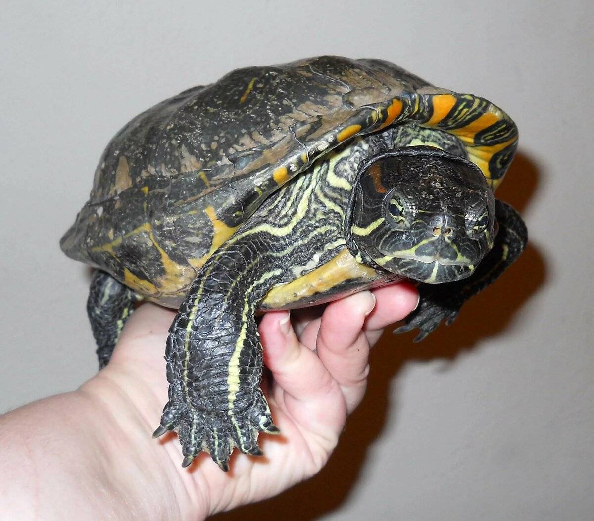 Взрослую черепаху берут по бокам от панциря двумя руками, всё ещё придерживая живот. Не стоит долго держать её в воздухе.