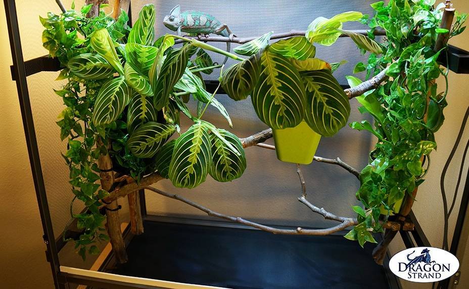 Внутри террариум нужно задекорировать растениями и обязательно поставить толстые трости или положить корягу, по которой будет лазить хамелеон. Можно поставить небольшой водоем, в котором питомец сможет купаться. Главное в обустройстве – чтобы рептилия могла найти для себя тихий, укромный уголок.