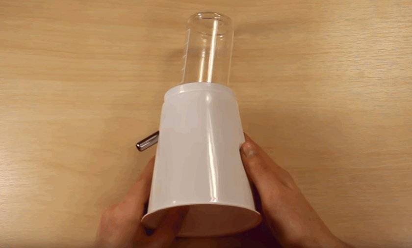 Делаем подставку для автопоилки из большого и плотного пластикового стаканчика. Диаметр дна стаканчика должен быть немного больше диаметра автопоилки. Переворачиваем стаканчик, ставим поилку в центр. Отмечаем маркером на дне стаканчика контур отверстия для автопоилки и вырезаем по намеченной линии. На боковой части стаканчика отмечаем и делаем отверстие для трубочки на нужной высоте. Вставляем автопоилку в сделанную подставку и помещаем в контейнер.