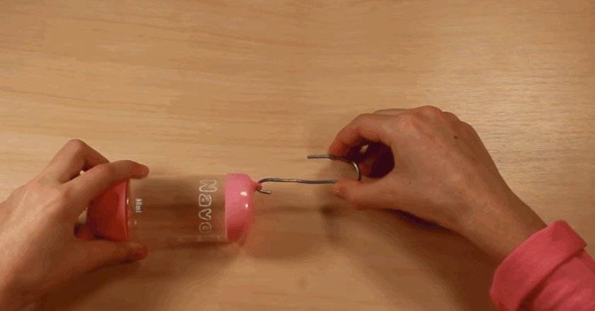 - Если у вас поилочка с отверстием в крышке для крепления, то достаточно сделать из кусочка проволоки двухсторонний крючок. С одной стороны петельку делаем побольше для крепления за край клетки или контейнера, а с другой стороны на маленькую петельку цепляем поилочку.