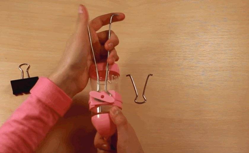 Если в комплекте с поилкой есть крепление для клетки, то прикрепить её на контейнер поможет большой канцелярский зажим. Вынимаем одну проволочку и делаем из длинного куска проволоки петельку такой же формы, но побольше. Цепляем крепление поилки за сделанную петельку. Крепим зажим на край контейнера. Вставляем в зажим новую проволочку вместе с поилкой.