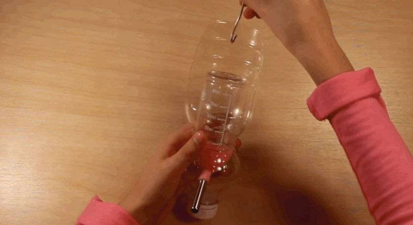 Понадобится пластиковая бутылка с немного большим диаметром, чем поилочка. Отрезаем дно бутылки и часть боковой части так, чтобы установить её в бутылку. Делаем маленькое отверстие на краю бутылки для крепления проволоки и небольшое отверстие в нижней части для трубочки. Помещаем поилочку в бутылку и крепим крючок из проволоки, подвешиваем в контейнере.