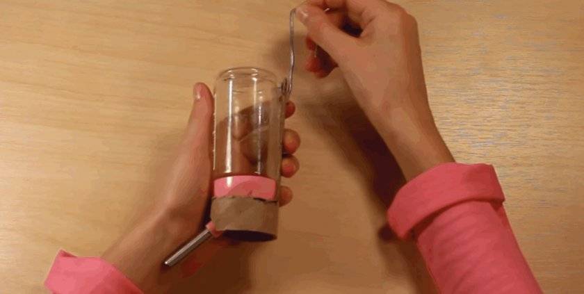 Делаем подставку из втулки из-под туалетной бумаги или бумажных полотенец. Намечаем маркером контуры на боковой части втулки и отметку отверстия для крепления проволоки, вырезаем. Чтобы поместить поилку, вырезаем небольшой полукруг в нижней части втулки для носика поилочки. Вставляем поилку в подставку, продеваем проволоку в отверстие и подвешиваем за край контейнера.