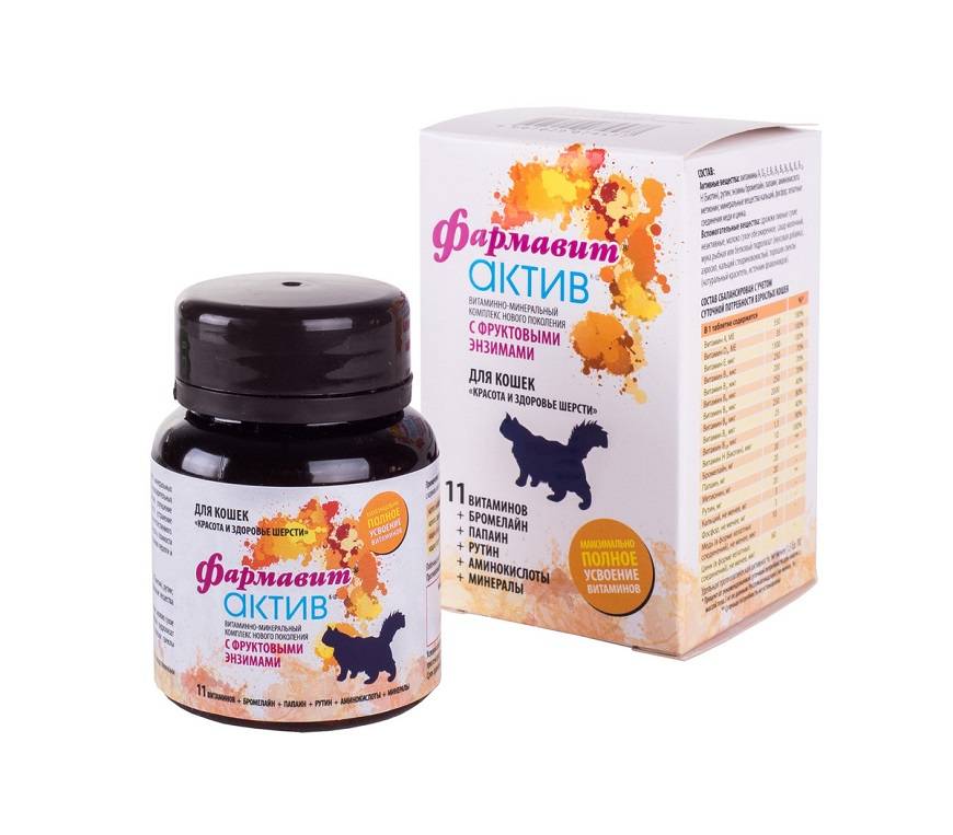Фармавит Актив хорошо зарекомендовал себя как средство для профилактики сухости кожи, возникновения перхоти и шелушения. Особенно он актуален при густом и длинном пушке. Среди дополнительных эффектов витаминного комплекса для кошек – повышение уровня энергии и улучшение обмена веществ.