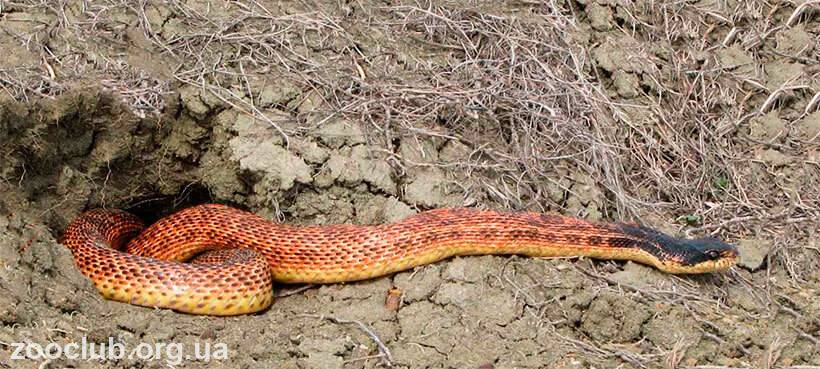 Средняя по размерам змея, длина тела примерно 80 см. Изучая виды змей в России, нельзя не обратить внимания на это скрытное, загадочное создание, обитающее в Чечне, юге Ставропольского края. Встреча с ним – большая удача.