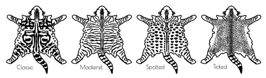 Классический табби, мраморный табби — широкие спиральные полосы на боках, напоминающие мраморные разводы, три полосы вдоль хребта, пятнистый живот, на хвосте и лапах полосы в виде колец.