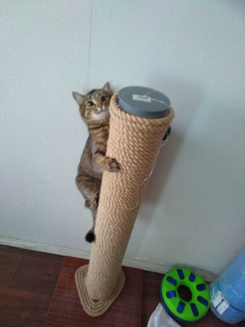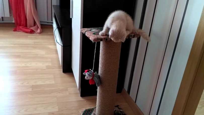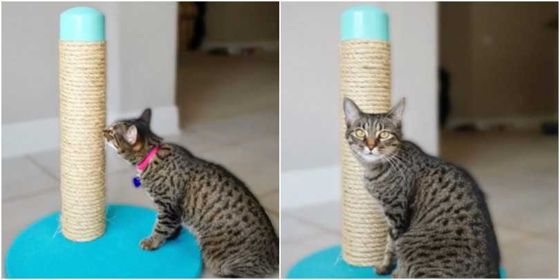 Как только в доме появилась когтеточка для кошек, нужно привлечь внимание животного к новой вещи. Можно повесить на нее игрушку на веревочке, бантик или мячик, чтобы питомец заметил