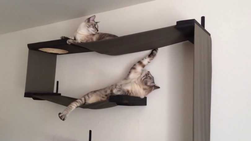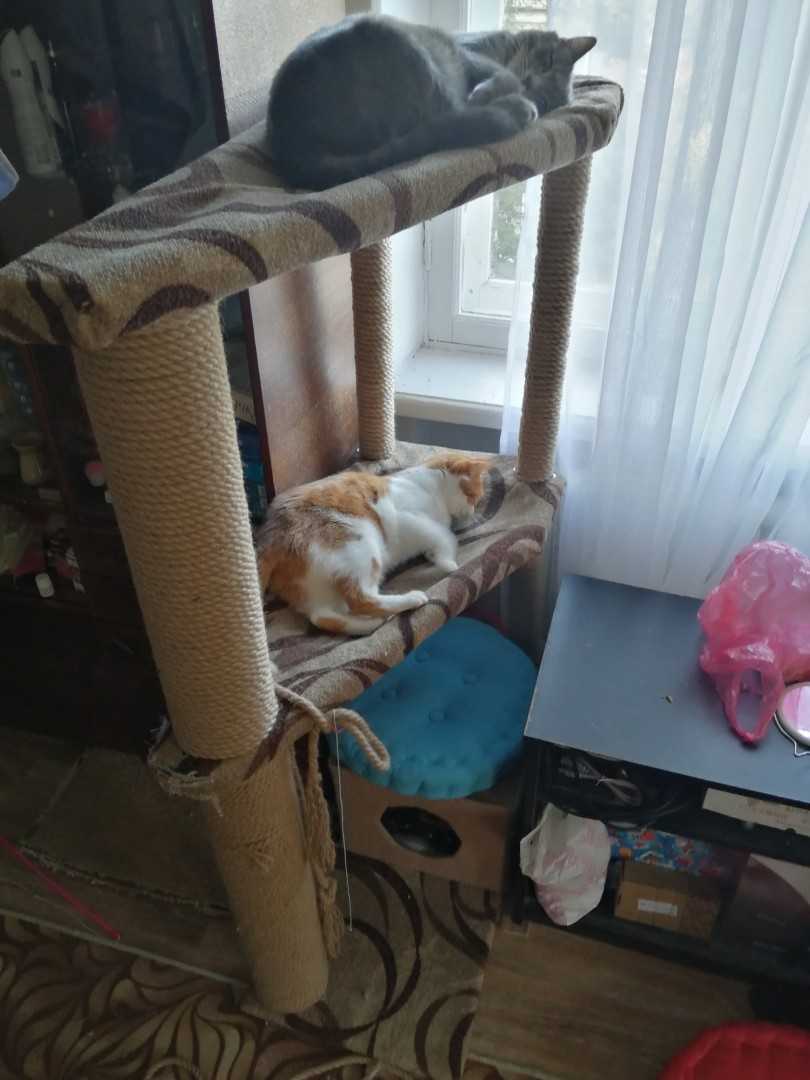 Когда хозяин содержит двух котов, то необходимо соорудить для них домик с учетом их поведения, причем так, чтобы они не мешали друг другу. Поведение котов может быть различным: некоторые коты дружат и легко уживаются на одной площадке, а бывают случаи, когда один из них доминирует. В таком случае можно предположить, что один из них захочет занять самое удобное и самое высокое место. Если коты не дружат, то площадки лучше разнести, а если дружат, то можно соорудить одну общую, но большую площадку на самой вершинке конструкции.