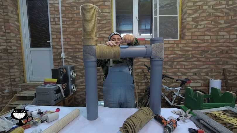 - Затем устанавливается столбик, который будет выполнять роль когтеточки и поверхности для перемещения кота по игровому комплексу. Для этого берется трубка и оклеивается канатным шнуром. Последний край каната можно зафиксировать жидкими гвоздями.