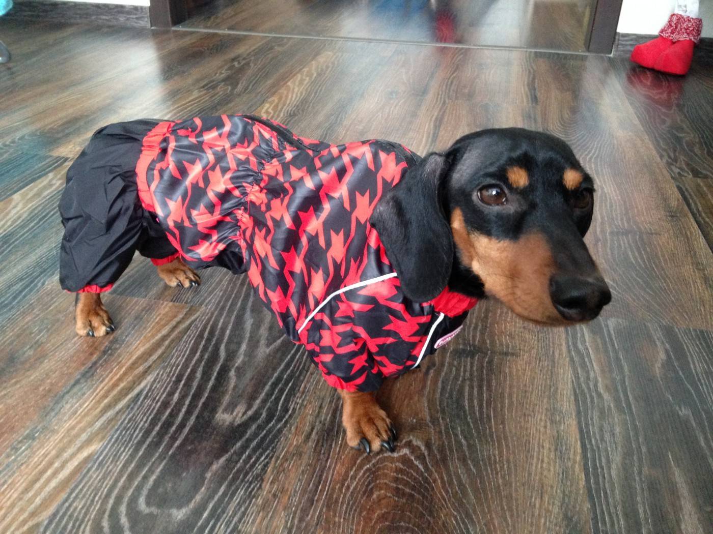 В дождливую погоду необходимо надевать на своего питомца вещи с водонепроницаемым верхом. В этом случае лучше всего подойдет плащевая и болоньевая ткань.