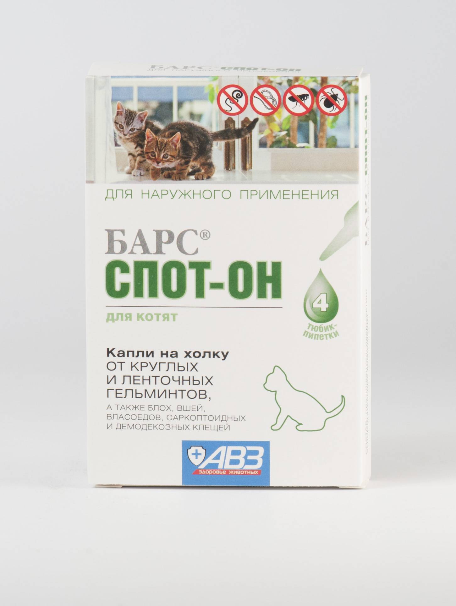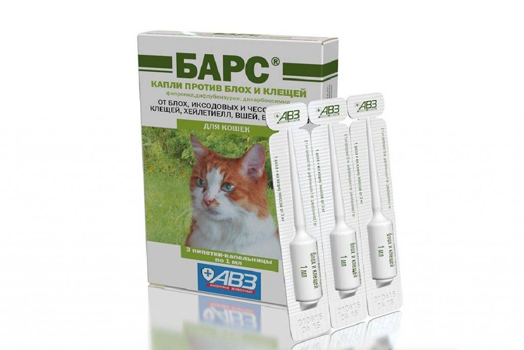 - Барс. Это капли от блох, клещей (иксодовых, чесоточных), вшей, власоедов, применяются для кошек, возрастом от 8 недель. В упаковке 3 пипетки по 1 мл каждая. Дозировку для некрупных котов рассчитывают по каплям, при весе животного до 1 кг — 10 капель, от 1 до 3 кг — 20 капель. Одна пипетка предназначена для животных, весящих 3 кг и более. Для котят эти капли выпускают со специальной маркировкой.