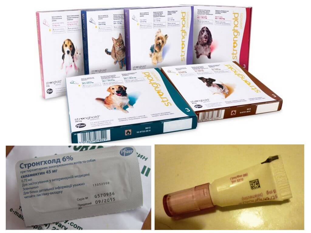 - Стронгхолд. Применяется для борьбы с блохами, клещами, внутренними паразитами. Проявляет высокую активность при профилактике дирофиляриоза. Для кошек содержание основного вещества в нём 6%, форма выпуска — пипетки объёмом: