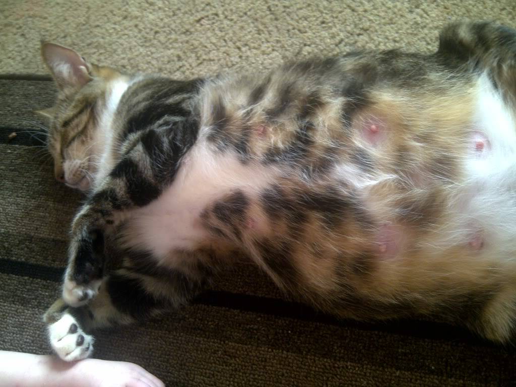- Хорошо выраженное, заметное изменение цвета сосков: они приобретают более насыщенный розовый оттенок. Впрочем, этот признак проявляется далеко не у всех кошек.