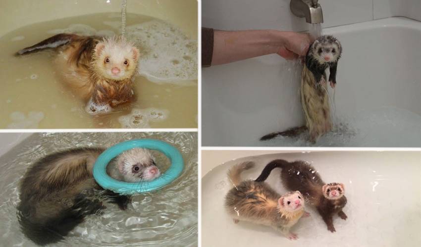 Хорьки обожают принимать водные процедуры, но после купания у них становится более выраженным характерный резкий запах. Из-за этого купать питомцев следует по мере того, как будет загрязняться шерсть. Купание можно проводить в не очень горячей ванночке или под душем. При купании используется специальный шампунь для животных. Обязательно каждый месяц подстригать ногти питомцу