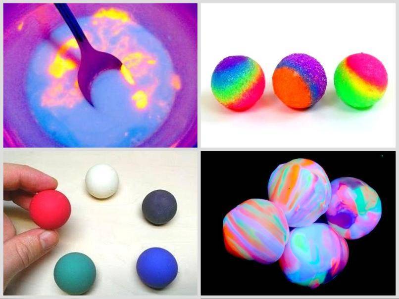 Чтобы заставить сверкать прыгунчик в лучах света, можно добавить вместе с красителем блестки. Если же приготовить несколько составов разного цвета, а затем их слепить вместе, получится очень красивый цветной попрыгунчик.