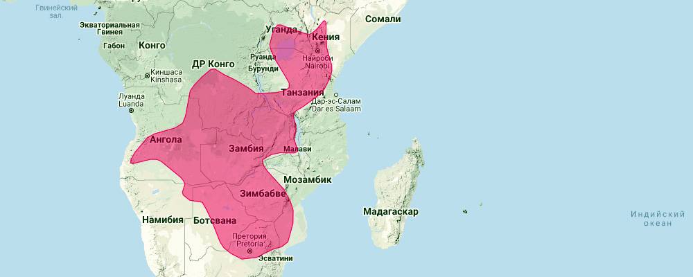 Встречается на обширной территории Африки: от северной части Южной Африки через Северо-Восточную Намибию, восточную и центральную Ботсвану, Анголу, Зимбабве, Малави, Замбию и Мозамбик на север до Демократической Республики Конго. В Восточной Африке они встречаются в Танзании, Кении и Уганде.