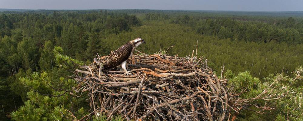 По большей части для гнездования скопа выбирает обширные, поросшие сосной верховые болота рядом с крупными водоемами, в основном с озерами. Иногда пернатый хищник встречается и среди моховых болот, чередующихся сухими грядами покрытыми старыми ельниками, смешанными лесами или сосновыми борами.