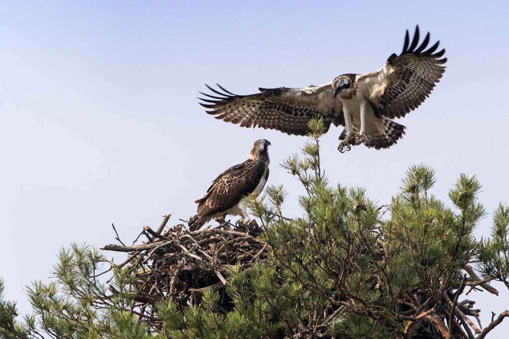Поэтому большая часть гнезд скопы на этой территории устроена непосредственно над водой, на засохших частично затопленных деревьях. Это очень опасная ситуация, ведь эти деревья быстро гниют и в какой то миг прекращают служить надежной опорой для гнезда, падая в воду вместе с гнездами.